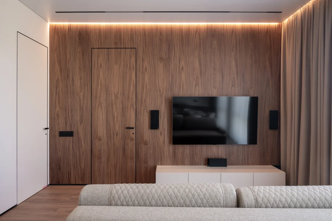 Этот проект — пример того, как премиальный ремонт под ключ может сочетать комфорт, эстетику и индивидуальность заказчиков. В интерьере использованы натуральные материалы и тёплые оттенки дерева, ротанг, декоративная плитка, керамогранит с фактурой камня и песка. Все решения — от встроенной кухни до шкафа для рукоделия и дизайнерской постирочной — направлены на то, чтобы даже небольшая квартира выглядела просторной и уютной.