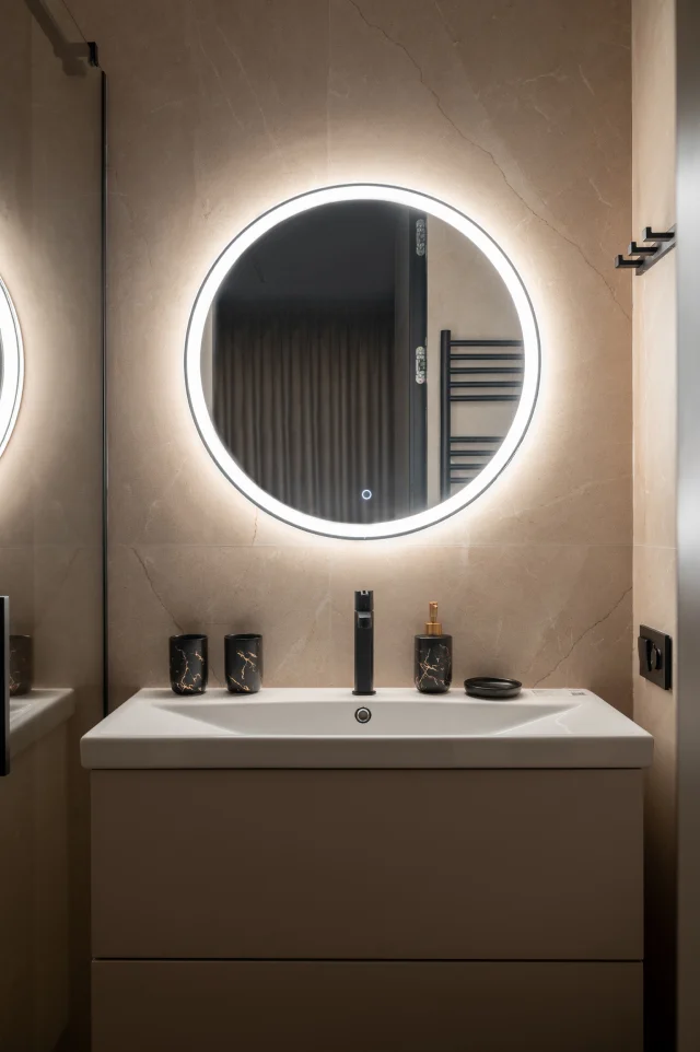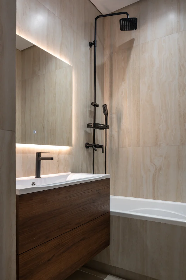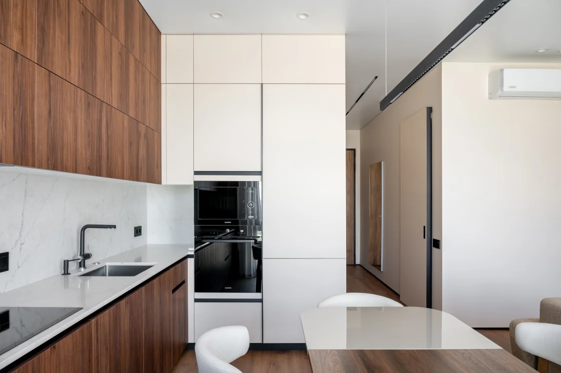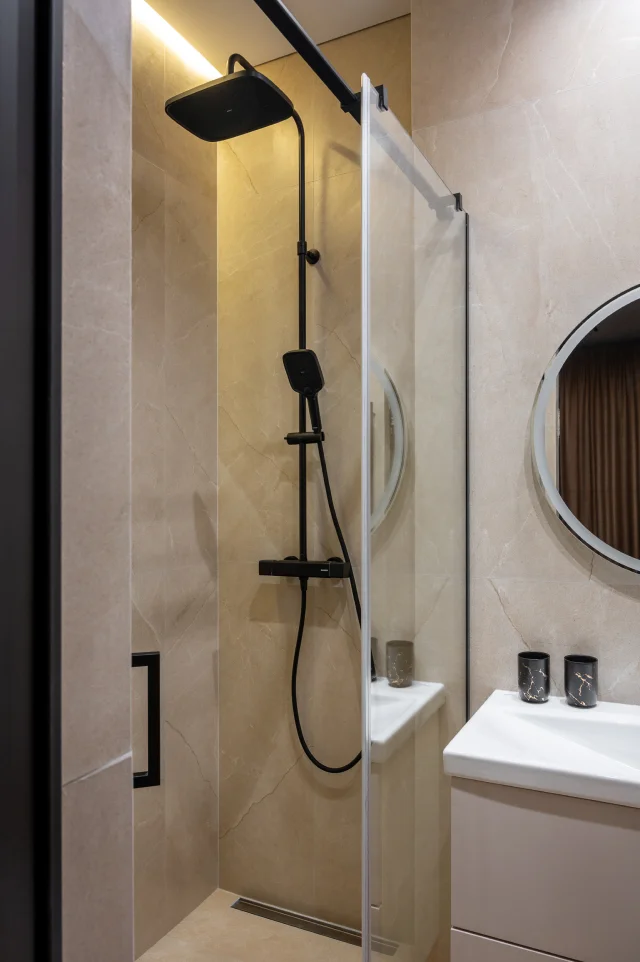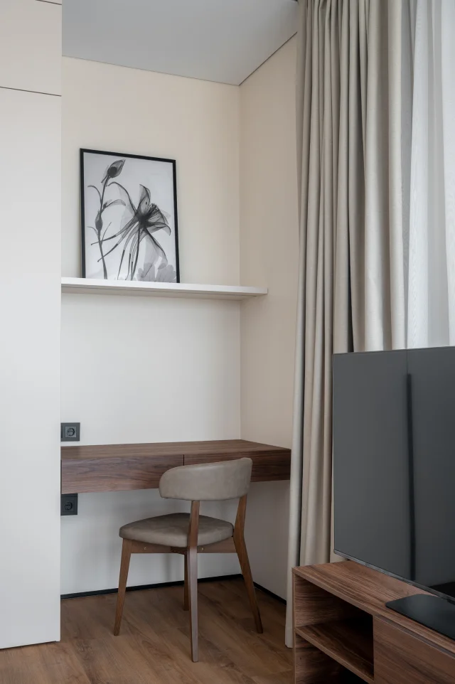 Санузел в нейтральной гамме с керамогранитом, деревом, современной сантехникой, датчиками протечки и проточным водонагревателем. Зеркало во всю стену расширяет коридор, фасады поднимают пространство, а мебель и текстиль в нюансных оттенках формируют атмосферу премиального минимализма. Проект демонстрирует, как реализовать элитный ремонт под ключ даже на компактной площади.
