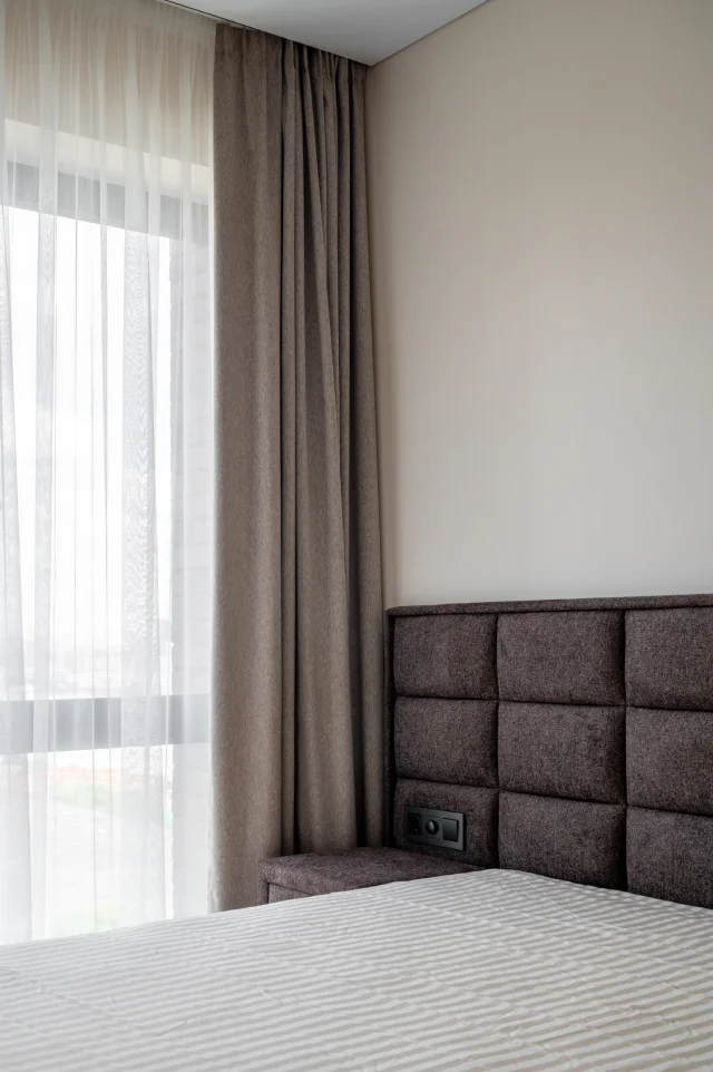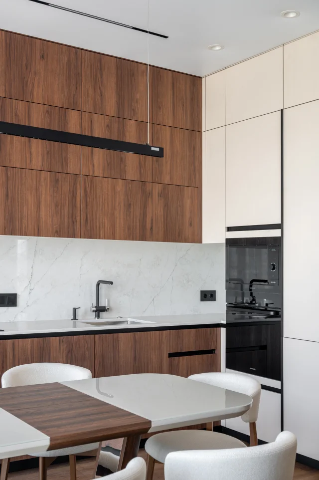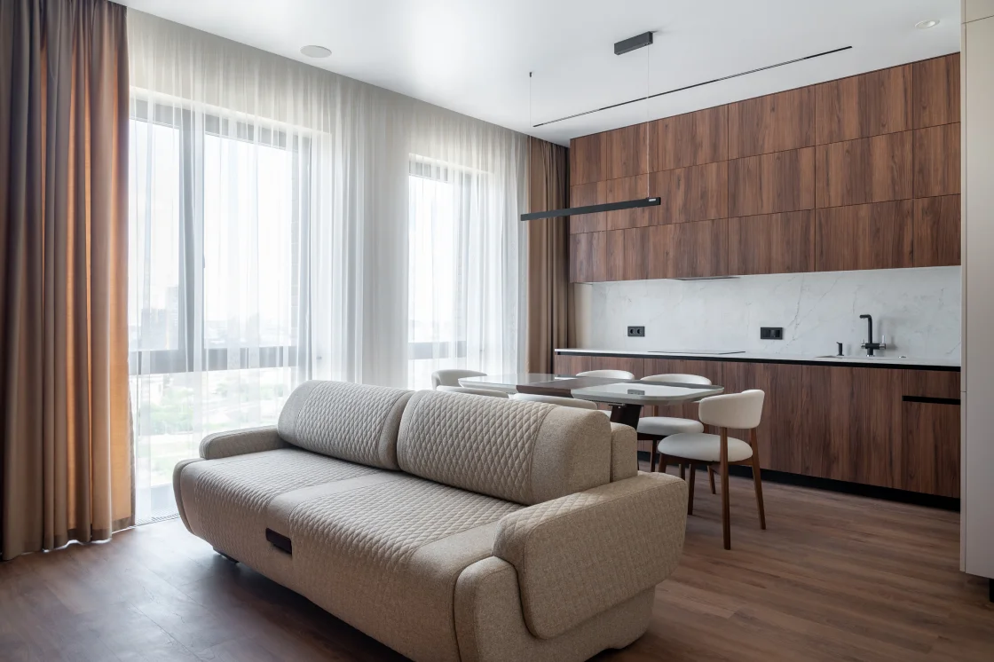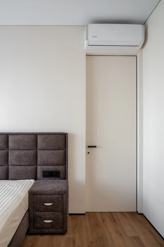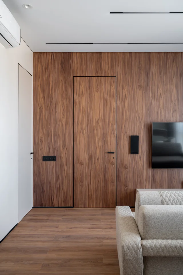 Санузел в нейтральной гамме с керамогранитом, деревом, современной сантехникой, датчиками протечки и проточным водонагревателем. Зеркало во всю стену расширяет коридор, фасады поднимают пространство, а мебель и текстиль в нюансных оттенках формируют атмосферу премиального минимализма. Проект демонстрирует, как реализовать элитный ремонт под ключ даже на компактной площади.