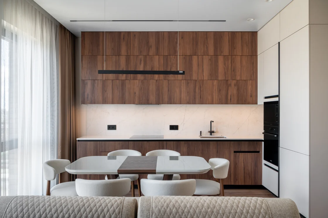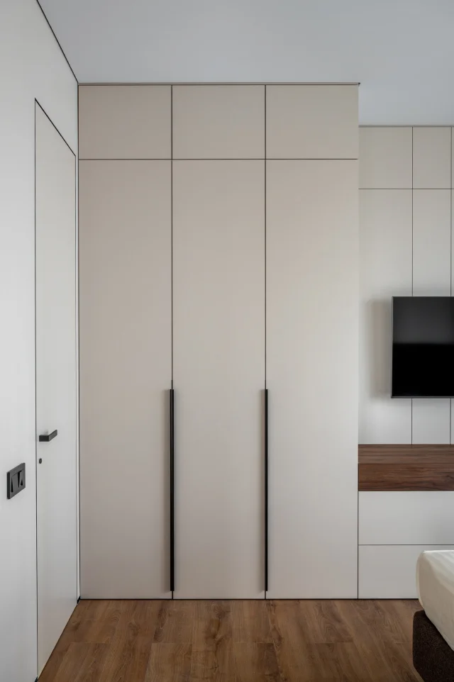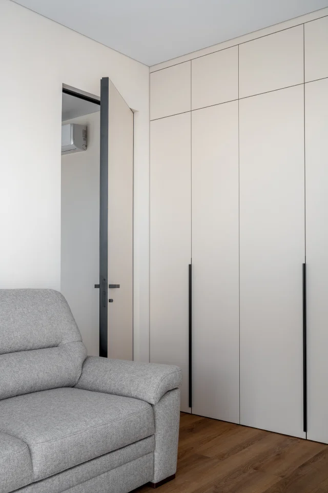 Проект студии Enterio — современная квартира 60 м² в Москве в стиле минимализм. Из бетонного пространства создан уютный дом для командировок и отдыха семьи. На компактной площади разместились кухня-гостиная, спальня, кабинет-гостевая, ванная, две гардеробные и постирочная. Ключевые решения: прямая кухня портального типа с фасадами до потолка, встроенная техника, скрытая инженерия, акриловые подоконники и ревизионные люки под керамогранит. В спальне — изголовье из 3D-панелей с подсветкой и зеркальные шкафы, в кабинете — рабочая зона и диван-трансформер.